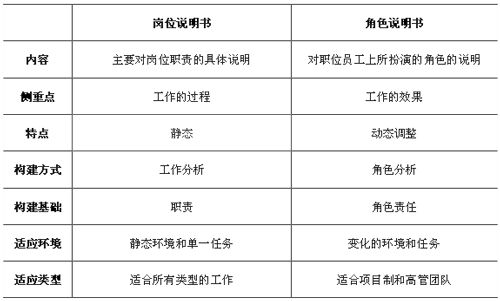 基于上述原因,西方的人力資源工作者提出,應當以角色(作用)分析來代替傳統的針對崗位的工作分析,提倡拋棄傳統的職位說明書,代之以角色說明書,提倡在進行工作分析和編寫說明書的時候,將重點放在角色(作用)上,更加強調結果而非過程。這種從關注“崗位”轉變到關注“工作作用”的趨勢更加適合研發團隊、高層管理團隊、銷售團隊、咨詢團隊等這種對以團隊工作模式而非以個人為基礎開展工作的組織。角色說明書與傳統的崗位說明書的區別如下。