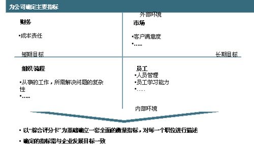 具體的步驟是運用平衡積分卡,結合關鍵成功因素所確定的一套全面的衡量指標,從四個方面進一步規范化描述職位的角色和定位,在明確職責的基礎上,描述清楚不同崗位所側重實現的角色和要達到的目的。