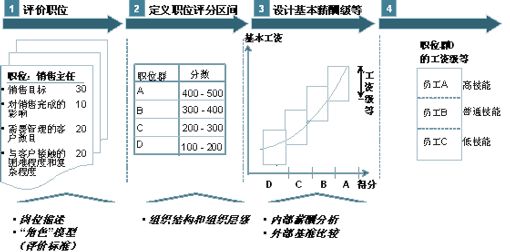 通過對不同項目中職位角色的打分,判定出不同項目類型中,不同職位的相對重要程度,克服了目前不同類型的項目,同一個人所負職責一樣,扮演的角色不一樣,卻拿一樣的薪酬,遵守同一薪酬體系的弊端。進而針對不同項目給予扮演不同角色的位置以不同的薪酬等級,保證了薪酬的對內公平性,是對傳統基于崗位的薪酬體系和基于能力的薪酬體系一種完善,其步驟如下。