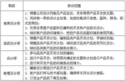 對于專業技術崗位的員工,企業在為其設置了技術職業發展通道后,接下來要做的就是將通道分為幾個職層,然后對每個職級崗位的責任范圍進行梳理。筆者在為一家服裝企業做咨詢的過程中,通過深度訪談和業務分析,將該企業的設計師分為四個層次:首席設計師、高級設計師、設計師和助理設計師。每個層次的責任范圍見下表: