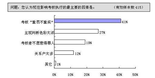 作為一名企業管理咨詢顧問,在提供管理咨詢服務的過程中,筆者發現,“考核‘重罰不重獎’”往往是員工反映最集中問題之一。這是因為多數企業的績效管理制度中,處罰規定遠多于獎勵規定,從而出現了“做得越多,罰得越多”的情況,故員工不愿意去承擔更多的責任,企業上下呈現出一種“及格追求”的態勢。 前不久筆者為陜西某制造企業A提供管理咨詢服務,調查問卷結果顯示,有超過40%的接受調查者認為“考核‘重罰不重獎’是影響考核執行的最主要因素”,參見圖1。